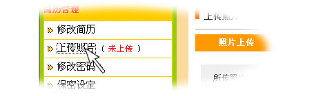 注冊(cè)成功后系統(tǒng)會(huì)自動(dòng)跳轉(zhuǎn)到個(gè)人管理頁(yè)面,點(diǎn)擊“上傳照片”,上傳不大于100KB的照片,這樣更容易讓招聘企業(yè)青睞; |